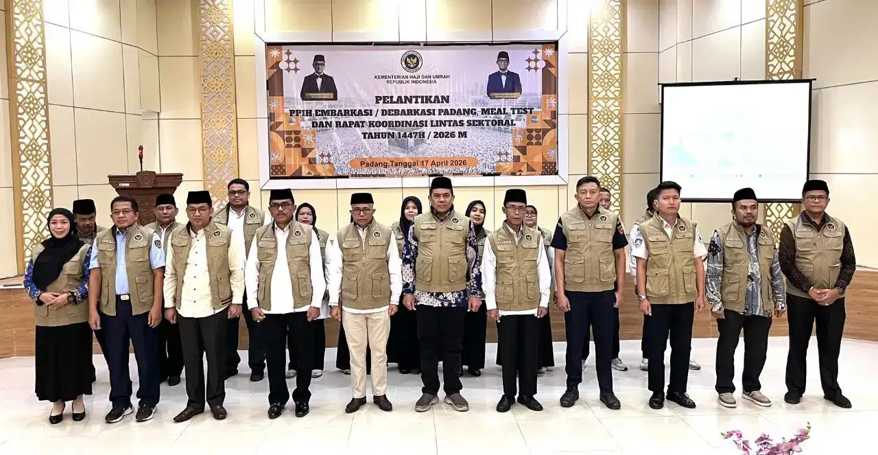 Padang – Sebanyak 25 Petugas Penyelenggara Ibadah Haji (PPIH) Embarkasi Padang resmi mengemban tugas setelah dilantik secara daring oleh Menteri Haji dan Umrah, Mochamad Irfan Yusuf, dari Asrama Haji Embarkasi Sukolilo, Surabaya, Jumat (17/4/2026). Pelantikan yang berlangsung di Asrama Haji Tabing, Kota Padang ini menjadi langkah awal kesiapan embarkasi dalam menyambut musim haji tahun ini.
