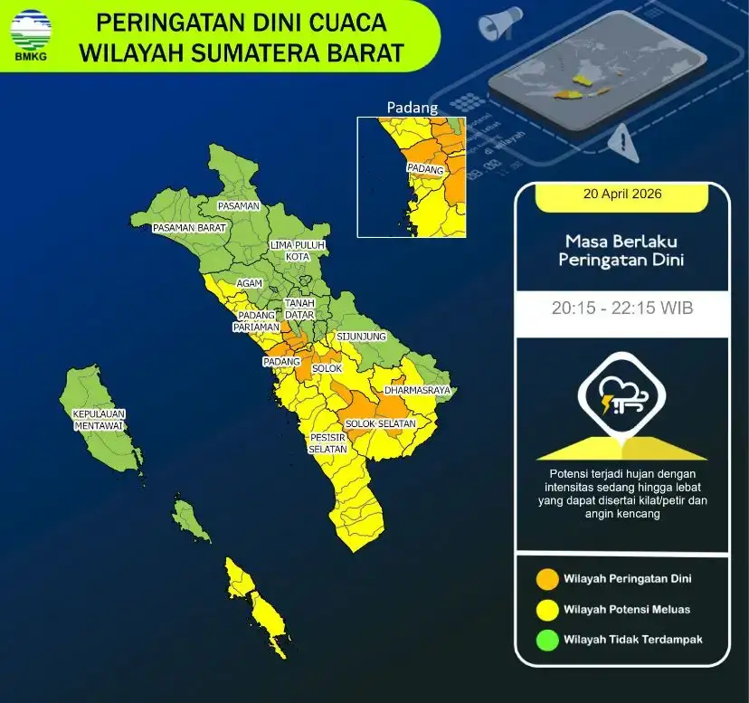 Padang – Badan Meteorologi, Klimatologi, dan Geofisika (BMKG) mengeluarkan peringatan dini cuaca ekstrem untuk wilayah Sumatera Barat pada Senin (20/4/2026). Masyarakat diimbau meningkatkan kewaspadaan terhadap potensi hujan intensitas sedang hingga lebat yang disertai kilat dan angin kencang hingga pukul 22.15 WIB.